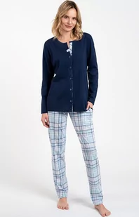 Piżama damska grantowa na długi rękaw i z długą nogawką Emilly uszyta z miękkiej bawełny. Dwuczęściowy komplet składa się z bluzy zapinanej na napy oraz spodni z wygodną gumką w pasie. Ten modny komplet dostępny jest w dwóch kolorach bluz: różowym i granatowym. Dzięki możliwości rozpinania całej góry, piżama idealnie nadaje się dla kobiet karmiących.