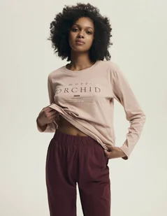 Model Dorla 43733 to połączenie wygody i subtelnej elegancji. Bluzka z długim rękawem w przyjemnym, stonowanym różu świetnie komponuje się ze spodniami w ciemniejszej, bordowej tonacji, tworząc modny, harmonijny zestaw. Bawełniana dzianina jest miękka, przyjazna dla skóry i przewiewna, dzięki czemu piżama idealnie sprawdzi się zarówno do snu, jak i wieczornego odpoczynku. Elastyczna talia zapewnia idealne dopasowanie do sylwetki i komfort przy każdym ruchu. Nadruk „Orchid” na bluzce nadaje całości lekkiego, kobiecego stylu i sprawia, że komplet prezentuje się bardziej nowocześnie.