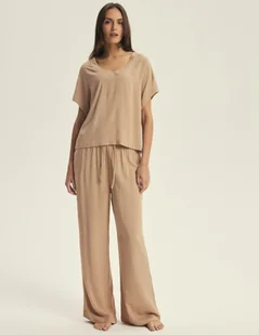 Piżama Corenso w odcieniu jasnego brązu to codzienna przyjemność zamknięta w prostym, ale pełnym wdzięku fasonie. Jasnobrązowa barwa przywołuje ciepło późnego popołudnia, a miękka, lejąca się wiskoza otula ciało niczym ulubiony kocyk. Krótkie rękawy i szerokie nogawki pozwalają skórze oddychać, a luźny krój nie krępuje ruchów. To propozycja dla kobiet, które cenią wygodę bez rezygnowania z kobiecego wyrazu.