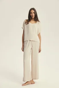 Elastyczny pas z troczkiem umożliwia indywidualne dopasowanie, bez uczucia ucisku. Cechy produktu: Damski komplet 2-częściowy – T-shirt + długie spodnie 2w1: Piżama damska i komplet domowy Skład materiału: 100% wiskoza – naturalna, oddychająca i miękka Koszulka typu box z dekoltem V i krótkim rękawem Spodnie z długą, szeroką nogawką Elastyczny pas z regulowanym troczkiem Kolor jasnego beżu o ponadczasowym, minimalistycznym charakterze