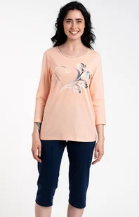 Piżama damska łososiowo-granatowa z rękawem i nogawką 3/4 Arietta to doskonały wybór na cieplejsze noce. Naturalny, przyjemny bawełniany materiał sprawi, że skóra będzie swobodnie oddychała, a luźny krój pozwoli przybierać swoje ulubione pozycje podczas snu, wygodne i komfortowe. Bawełniana damska piżama ze spodniami i rękawami posiada bluzę wykończoną okrągłym dekoltem i ozdobnym, uroczym nadrukiem wykonanym metodą sitodruku, z kolei spodnie mają funkcjonalne kieszonki.