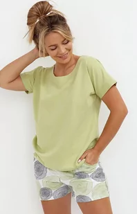 Piżama damska na krótki rękaw i z krótką nogawką 253, wykonana z wysokiej jakości bawełny, zapewnia komfort i trwałość. Jednolita koszulka z krótkim rękawem posiada półokrągły dekolt, dodając jej prostoty i elegancji. Do kompletu dołączone są wzorzyste spodenki z wygodnymi kieszeniami po bokach, co zwiększa funkcjonalność i wygodę noszenia.