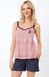Piżama damska na wąskie ramiączko czerwono-granatowa Flota to wyjątkowe połączenie delikatnej kobiecości z ponadczasową estetyką marynistyczną. Górną część stanowi top na cienkich ramiączkach, o lekkim trapezowym kroju, który subtelnie układa się na sylwetce. Czerwono-granatowy wzór w paski dodaje całości charakteru, a głęboki dekolt wykończony kontrastową lamówką podkreśla kobiece linie. Na piersi znajduje się drobny nadruk z motywem żaglówki stylowy detal inspirowany letnią beztroską. Dolną część kompletu tworzą krótkie, jednolite spodenki z kieszeniami i elastyczną, nieuciskającą gumką