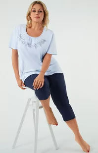 Piżama damska niebiesko-granatowa Zarita prezentuje się niezwykle stylowo. Wykonana z wysokiej jakości bawełny posiada prosty, luźny krój. Na wysokości biustu uwagę zwraca kobieca, kwiatowa aplikacja. Lekka piżama posiada również okrągły dekolt, urozmaicony dekoracyjnym marszczeniem. W komplecie znajdują się spodnie o długości .