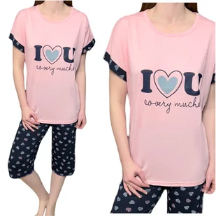 Piżama damska: w kolorze różowym z 3/4 spodniami w granatowe serduszka to idealna propozycja dla kobiet ceniących wygodę i styl. Wykonana z miękkiego materia...