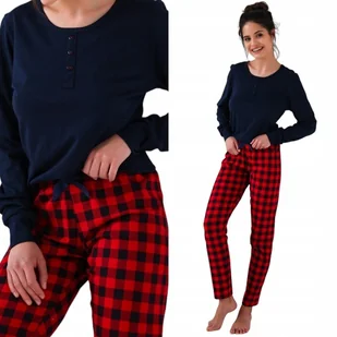 Piżama damska SENSIS Bonnie XL / 42 Granatowy Fikuśna piżama damska bonnie firmy SENSIS z wysokiej jakości bawełny. Koszulka w granatowym kolorze z długim rękawem i dekoltem okrągłym zapinanym na trzy guziki. Do kompletu długie spodnie w czarno czerwoną kratkę bez ściągaczy z satynową kokardką w pasie. Bardzo wygodny fason, delikatnie dopasowany do ciała. Całość prezentuje się niezwykle kobieco i elegancko.