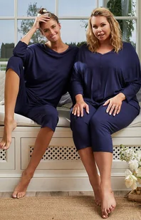 Komfortowa piżama damska z rękawem i nogawką o długości 3/4. Wykonana z wiskozy wzbogaconej elastanem. Dostępna w kolorze granatowym. Piżama pięknie prezentuje kobiecą sylwetkę, uwydatniając jej atuty. Góra piżamy została uatrakcyjniona ciekawym przeszyciem na środku przodu, zaś dekolt został wykończony atłasową lamówką w kolorze granatowym, dodając eleganckiego sznytu całości.