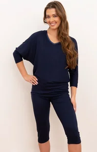 Komfortowa piżama damska z rękawem i nogawką o długości 3/4. Wykonana z wiskozy wzbogaconej elastanem. Dostępna w kolorze granatowym. Piżama pięknie prezentuje kobiecą sylwetkę, uwydatniając jej atuty. Góra piżamy została uatrakcyjniona ciekawym przeszyciem na środku przodu, zaś dekolt został wykończony atłasową lamówką w kolorze granatowym, dodając eleganckiego sznytu całości.