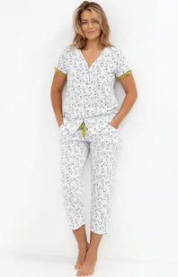 Piżama damska w kwiatowy print 244 to doskonały wybór dla każdej kobiety, która ceni sobie wygodę i styl. Wykonana z wysokiej jakości bawełny w kwiatowy print, zapewnia nie tylko komfort, ale i modny wygląd. Koszulka z krótkim rękawem i dekoltem w kształcie litery "V" dodaje kobiecości i elegancji. Spodnie w długości 7/8 posiadają wygodne kieszenie na wysokości bioder, co czyni tę piżamę zarówno praktyczną, jak i atrakcyjną wizualnie.