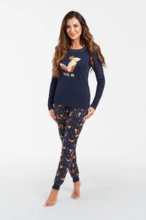 Piżama damska wykonana jest z bawełny i posiada piękny nadruk z wesołym lisem. Piżama wykonana jest z bawełny, dzięki czemu jest przewiewna i bardzo wygodna. T-shirt piżamy ma długie rękawy i okrągły dekolt. Ma ciemnoniebieski kolor i pomarańczowe detale. Posiada nadruk z motywem lisa oraz napis Hug me.