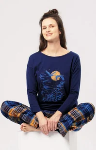 Piżama damska z błyszczącą nitką LNS 937 niezwykle ciepła i wygodna. Wyjątkowe, dodające energii kolory złocistego miodu i głębokiego granatu wprawią Ciebie i Twoje ciało w doskonały nastój. Całość lekko wycisza jednolita granatowa góra z rysunkiem lecących żurawi. Swobodny krój bluzki o obniżonym szwie ramienia jest wygodny podczas snu. W bluzce poczujesz szybkie ogrzanie Ciała dzięki dodatkowi do bawełny włókien poliestrowych.