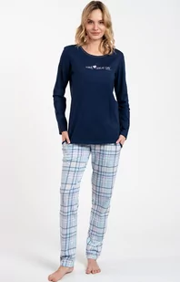 Piżama damska z długim rękawem i długą nogawką Glamour z uroczym nadrukiem. Dostępna w dwóch wersjach kolorystycznych: z różową i granatową bluzą. Piżama wykonana w 100% z delikatnej bawełny, która zapewnia poczucie ciepła w chłodniejsze dni. Góra zestawu ma lekko luźny krój i półokrągły dekolt.