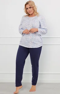 Piżama damska z długim rękawem i długimi spodniami Jowita to rozwiązanie dla entuzjastek kwiatowych printów. Posiada prosty, wygodny fason, zapewniający komfort podczas snu. Górna część to bluzka pokryta florystycznym nadrukiem z okrągłym dekoltem oraz zapięciem na guziki typu polo. Dół to z kolei długie, gładkie, utrzymane w jednolitym kolorze spodnie z praktycznymi kieszeniami. Całość wykonana z ciepłej bawełnianej dzianiny dresowej, dzięki czemu piżama doskonale sprawdza się również jako wygodny strój do noszenia po domu.