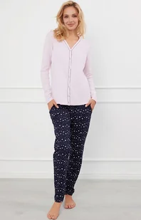 Piżama damska z długim rękawem różowo-granatowa Libra z bawełnianej dzianiny ściągaczowej, wyróżniająca się ponadczasowym designem. Posiada klasyczny fason z długim rękawem oraz dekoltem w kształcie litery V, który został obszyty delikatną nicią w kontrastowym kolorze. Uwagę przyciągają długie spodnie z modnym printem w gwiazdki. Po bokach praktyczne, wpuszczane kieszenie. Dodajmy, że jest to piżama damska rozpinana, a wyraźnie zaznaczony panel z guzikami dodaje całej stylizacji klasy i wdzięku.
