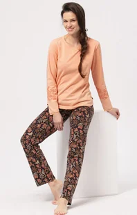 Piżama damska z długim rękawem w jarzębinę LNS 785 idealna na pierwsze chłodniejsze noce. Delikatna, melanżowa góra w ciepłym brzoskwiniowym kolorze. Okrągły dekolt i wygodna dla Ciała forma bluzki. Mankiety zakończone ozdobną koronką, a na rękawach subtelny rysunek pliszki siedzącej na gałązce jarzębiny. Proste, wygodne spodnie z kieszeniami i miękką gumką w pasie.
