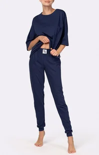 Piżama damska z krótkim rękawem granatowa Homie wykonana z niezwykle delikatnej i przewiewnej bawełny, zapewniającej komfort podczas snu. Piżama bawełniana z krótkim rękawem oraz długimi spodniami. Koszulka oversize z obniżoną linią ramion, kieszonką i dekoltem w łódkę. Długie spodnie z kieszeniami i ściągaczami przy nogawkach. Spodnie mają nieco wyższy stan oraz szeroką gumę w pasie, gwarantującą idealne dopasowanie.