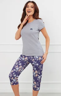 Piżama damska z krótkim rękawem i 3/4 spodniami szara Pulia posiada prosty i wygodny krój. Bluzka z okrągłym dekoltem obszytym kontrastową lamówką, na piersi po lewej stronie posiada praktyczną kieszonkę z dekoracyjną kokardką. Górna część idealnie komponuje się ze spodniami z nogawką o długości 3/4 oraz funkcjonalnymi kieszeniami.