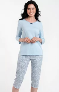 Piżama damska z rękawem i nogawką 3/4 Salli to idealna propozycja na cieplejsze letnie lub wiosenne noce. Prosty krój zapewni wygodę i swobodę ruchów, zaś lekki, przewiewny materiał komfort i przyjemność dla skóry. Bawełniana piżama damska ma prostą bluzę wykończoną okrągłym dekoltem i uroczą kokardką oraz spodnie z kieszeniami, zdobione ślicznym kwiatowym wzorem. Taka kobieca piżamka z pewnością uprzyjemni każdą noc.