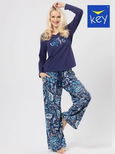 Piżama damska z długim rękawem wykonana z wysokiej jakości bawełny. Bluzka granatowa ozdobiona drobnym wzorem, spodnie długie wzorzyste o szerszym kroju. Skł...
