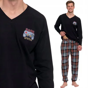 Piżama Męska Bawełniana z Nadrukiem Game Over i Spodniami w Kratę MORAJ XXL?✨ Spędzasz wieczory z padem w ręku albo po prostu cenisz wygodę i luz? Ta piżama męska MORAJ została stworzona właśnie dla Ciebie! Wykonana z miękkiej bawełny z dodatkiem elastanu, zapewnia elastyczność, oddychalność i maksymalny komfort podczas snu lub relaksu. Czarna koszulka z krótkim rękawem ozdobiona jest wyrazistym nadrukiem konsoli i napisem „Game Over”, idealnie oddając klimat wypoczynku po długim dniu. Dekolt w serek dodaje nowoczesnego charakteru, a brak metki na karku gwarantuje pełną wygodę bez podrażnień. Do zestawu dołączone są spodnie w kolorową kratę z elastycznym pasem i ściągaczami u dołu nogawek – perfekcyjne dopasowanie i swoboda ruchów w jednym. ➡️ Miękka bawełna z dodatkiem elastanu – elastyczna, oddychająca i przyjemna w dotyku ➡️ Czarna koszulka z nadrukiem „Game Over” – idealna dla graczy i miłośników luzu ➡️ Dekolt w serek – nowoczesny i wygodny fason ➡️ Wzorzyste spodnie w kratę – modny, kontrastowy akcent ➡️ Elastyczny pas i ściągacze – dopasowanie bez ucisku ➡️ Brak metki na karku – pełen komfort noszenia Ta piżama to połączenie komfortu, stylu i odrobiny humoru, które sprawi, że każdy wieczór stanie się Twoim ulubionym czasem na relaks.