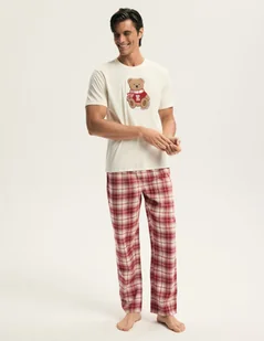 Model Chrismis wprowadza do męskiej garderoby domowej ciepło, spokój i dyskretny świąteczny akcent. To piżama zaprojektowana na zimowe wieczory i grudniowe poranki, gdy liczy się komfort, naturalne materiały i przytulna atmosfera. Klasyczna kolorystyka czerwieni i ecru w kratę buduje nostalgiczny klimat, a jasna góra równoważy całość spokojnym, ponadczasowym stylem. Komplet wykonano z 100% bawełny, która jest miękka, oddychająca i przyjazna dla skóry. Koszulka z krótkim rękawem ma prosty, wygodny krój i została ozdobiona haftowanym misiem w szaliku – detalem, który dodaje charakteru bez utraty męskiej estetyki.