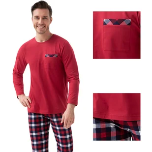 Bawełniana piżama męska składająca się z dzianinowego t-shirtu i spodni w granatowo-czerwoną kratę. Bordowa bluzka posiada półokrągły dekolt i długie rękawy ...