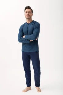 Bawełniana piżama męska składająca się z dzianinowej bluzki w drobny geometryczny wzorek i jednobarwnych spodni. Bluzka posiada półokrągły dekolt i zapięcie ...