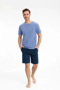 Bawełniana piżama męska niebiesko granatowa 807 od polskiej marki Luna. Wykonana z wysokiej jakości bawełny, gwarantującej wygodę podczas snu oraz trwałość materiału. Górę piżamy stanowi klasyczna koszulka w kolorze niebieskim, wyposażona w praktyczną kieszonkę na piersi. Do kompletu dołączone są krótkie spodenki w drobny geometryczny rzucik, które nadają całości wyjątkowego charakteru. Spodnie posiadają kieszenie.