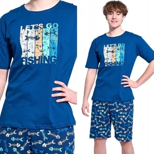 bluzki w kolorze morskim z młodzieżowym nadrukiem i napisem, krótkim rękawem oraz granatowych krótkich spodenek w kolorowe druki z wygodną gumką w pasie. Piżama swobodnie układa się na ciele, a przyjemny materiał pozwala skórze oddychać, dbając o zdrowy i bezpieczny sen. Młodzieżowa piżama męska z krótkim rękawem Piżama młodzieżowa CORNETTE 551/50 Fish to propozycja polskiego producenta dla młodych mężczyzn. Dostępna w modnym kroju i pięknym młodzieżowym kolorze, piżama uszyta jest z 100% bawełny. Idealna do snu i domowego relaksu.