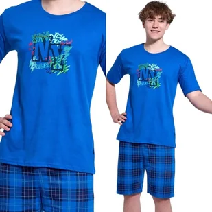 bluzki w kolorze niebieskim z młodzieżowym nadrukiem i napisem, krótkim rękawem oraz granatowo niebieskich krótkich spodenek w kratkę z wygodną gumką w pasie. Piżama swobodnie układa się na ciele, a przyjemny materiał pozwala skórze oddychać, dbając o zdrowy i bezpieczny sen. Młodzieżowa piżama męska z krótkim rękawem Piżama młodzieżowa CORNETTE 551/51 Freestyle to propozycja polskiego producenta dla młodych mężczyzn. Dostępna w modnym kroju i pięknym młodzieżowym kolorze, piżama uszyta jest z 100% bawełny. Idealna do snu i domowego relaksu.