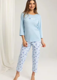 Bawełniana piżama damska. Koszulka z półokrągłym dekoltem i rękawem 3/4, z przodu ozdobny nadruk. Do kompletu spodnie wzorzyste o długości 7/8. Skład: 100% bawełna.