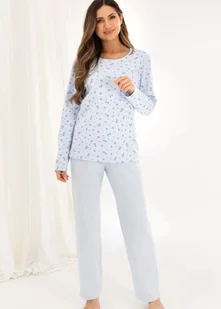 Ciepła piżama damska od wewnętrznej strony z ciepłym puszkiem. Koszulka z długim rękawem, półokrągłym dekoltem, czała we wzór w drobne kwiatki. Do kompletu jednolite spodnie, z długą nogawką i gumką w pasie. Skład: 100% bawełna.