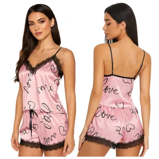 Piżama satynowa z nadrukiem i koronką - różowa - M