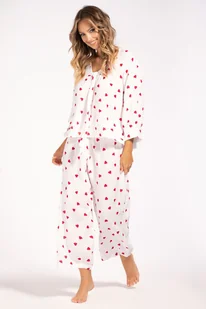 Urocza piżama damska.bluzka o luźnym krojurękaw 3/4dekolt okrągłyspodnie 7/8w pasie wygodna gumkawzór w serduszkaSkład: 100% bawełna.