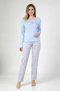 Bawełniana piżama damska, koszulka długim rękawem, dekolt półokrągły. Z przodu ozdobny nadruk, spodnie długie. Skład: 100% Bawełna