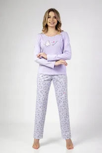 Bawełniana piżama damska, koszulka długim rękawem, dekolt półokrągły. Z przodu ozdobny nadruk, spodnie długie. Skład: 100% Bawełna