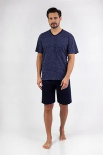 Bawełniana piżama damska granatowa 481 wykonana z wysokiej jakości dzianiny, zapewniającej komfort i przewiewność. Koszulka z krótkim rękawem oraz dekoltem w kształcie litery "V", uzupełniona o małą kieszonkę na piersi. Do kompletu krótkie spodenki, gwarantujące wygodę i swobodę ruchów. Idealna na ciepłe noce.