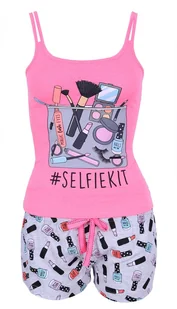 Różowo-szara, dwuczęściowa piżama damska. Koszulka na podwójnych, cienkich ramiączkach, z motywem kosmetyków oraz napisem "#Selfiekit". Spodenki z bezuciskow...