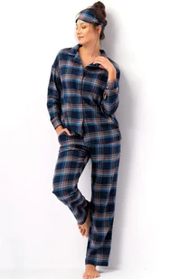 Rozpinana piżama damska w kratę LNS 431 w eleganckiej kolorystyce granatu i czekoladowego brązu, urozmaicona subtelną, błyszczącą nitką, która dodaje jej wyjątkowego charakteru. Wykonana z lekkiej, ciepłej i przyjemnej w dotyku flaneli bawełnianej, doskonale sprawdzi się w chłodne jesienne i zimowe noce. Góra piżamy to rozpinana koszula z klasycznym kołnierzykiem i nowym, luźniejszym krojem - obniżone ramiona oraz kontrafałda z tyłu gwarantują swobodę ruchów i pełen komfort podczas snu. Długość sięgająca do dolnej linii pośladków daje dodatkową warstwę ciepła, a mankiety przy rękawach doda