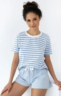 Sensis bawełniana piżama damska Latoya to letnia propozycja od marki Sensis, stworzona z myślą o kobietach ceniących wygodę i subtelny styl. Wykonana z wysokiej jakości bawełny, zapewnia przyjemne uczucie na skórze i doskonałą przewiewność w cieplejsze noce. Górę kompletu tworzy koszulka w poziome paski z krótkim rękawem i półokrągłym dekoltem wykończonym elastycznym ściągaczem, który podkreśla kobiecą sylwetkę. Dół to krótkie spodenki w delikatny paseczkowy wzór, z miękką talią i wiązaną tasiemką, która pozwala na indywidualne dopasowanie. Latoya łączy komfort bawełnianej bielizny nocne