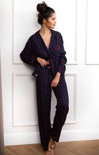 Sensis piżama damska rozpinana w serca Sophia to elegancki i komfortowy zestaw na chłodniejsze noce. Wykonana z wysokiej jakości wiskozy, zapewnia miękkość i wygodę noszenia. Koszulka z długim rękawem, zapięciem na guziki, klasycznym kołnierzykiem oraz naszytą na piersi kieszonką wyróżnia się printem w czerwone serduszka, nadającym całości romantycznego charakteru. Długie spodnie o prostym kroju uzupełniają zestaw, a satynowa kokardka w pasie dodaje subtelnej elegancji. To idealny wybór dla kobiet ceniących styl i wygodę w domowym zaciszu.