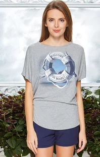 PIŻAMA DAMSKA BAWEŁNIANA motyw kwiaty spodnie 3/4 granat koszulka szara L