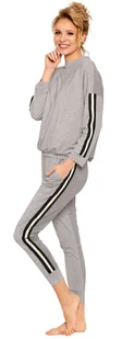 Śliczna piżama w szarym kolorze, w skład której wchodzi luźna bluzka na długi rękaw oraz długie spodnie. Spodnie z gumką w pasie oraz dwoma kieszonkami po bo...
