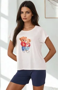 Urocza krótka piżama damska Sweet Night to idealna propozycja na komfortowy sen i domowy relaks. Góra z krótkim rękawem ozdobiona jest zabawnym nadrukiem przedstawiającym dwa misie, co nadaje całości pogodnego i pełnego wdzięku charakteru. Luźny krój zapewnia swobodę ruchów, a miękki i przewiewny materiał sprawia, że piżama jest niezwykle przyjemna dla skóry. Do kompletu dołączone są gładkie granatowe szorty o prostym fasonie, które doskonale uzupełniają jasną bluzkę. Ten zestaw łączy wygodę z uroczym designem, dzięki czemu każda noc stanie się jeszcze bardziej przytulna.