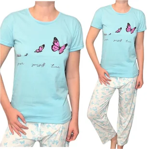 Urocza PIŻAMA DAMSKA długie spodnie krótki rękaw niebieski motyle XL