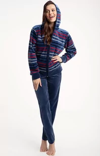 Welurowy dres damski ciemnoniebieski 341 jest miękki w dotyku i komfortowy w noszeniu, idealnie sprawdzi się jako strój domowy. Bluza damska posiada wzór w drobne paseczki, które świetnie maskują to, co powinny i podkreślają kobiecą sylwetkę. Model posiada kaptur, wygodne kieszenie i zamek ekspresowy. Spodnie dresowe są uzupełnieniem do bluzy, jednak bardzo często noszone są z koszulkami sportowymi, a nawet swetrami.