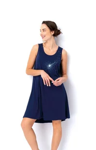 Wiskozowa koszula nocna w gwiazdy LND 764. Odkryj urok kosmicznego romantyzmu z piękną, granatową koszulką, która błyszczy jak spadająca gwiazda. Ta niezwykle przyjemna w dotyku koszulka wykonana z włókna wiskozowego zapewnia delikatny chłód na skórze i doskonałą przewiewność, co czyni ją idealnym wyborem na upalne letnie dni. Swobodny krój z szerokim dekoltem w kształcie U, który delikatnie eksponuje szyję. Długość w kolano lekko wydłużony tył dodaje elegancji i podkreśla kobiecą sylwetkę.