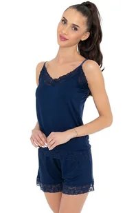 Wiskozowa piżama damska na ramiączka 151 to elegancki komplet w kolorze granatowym, idealny na ciepłe wieczory. Koszulka na cienkich, regulowanych ramiączkach zapewnia możliwość idealnego dopasowania, a delikatna koronka wykańczająca górną część bluzki oraz jej dół dodaje jej subtelnego uroku i kobiecego charakteru. Spodenki z krótkimi nogawkami również zdobione są koronką na krawędziach, co tworzy spójną, harmonijną całość, nawiązującą do zdobień na koszulce. Piżama wykonana z miękkiej i przewiewnej wiskozy zapewnia wyjątkowy komfort noszenia i pozwala czuć się stylowo nawet podczas snu.