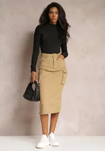 Beżowa Cargo Spódnica Midi z Paskiem i Ściągaczami Timnitos