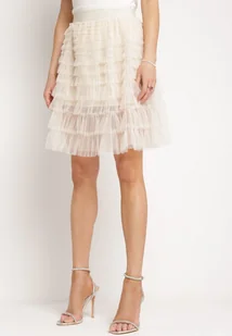 Beżowa Spódnica Rozkloszowana z Gumką w Talii Powleczona Tiulowym Materiałem Firila